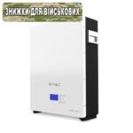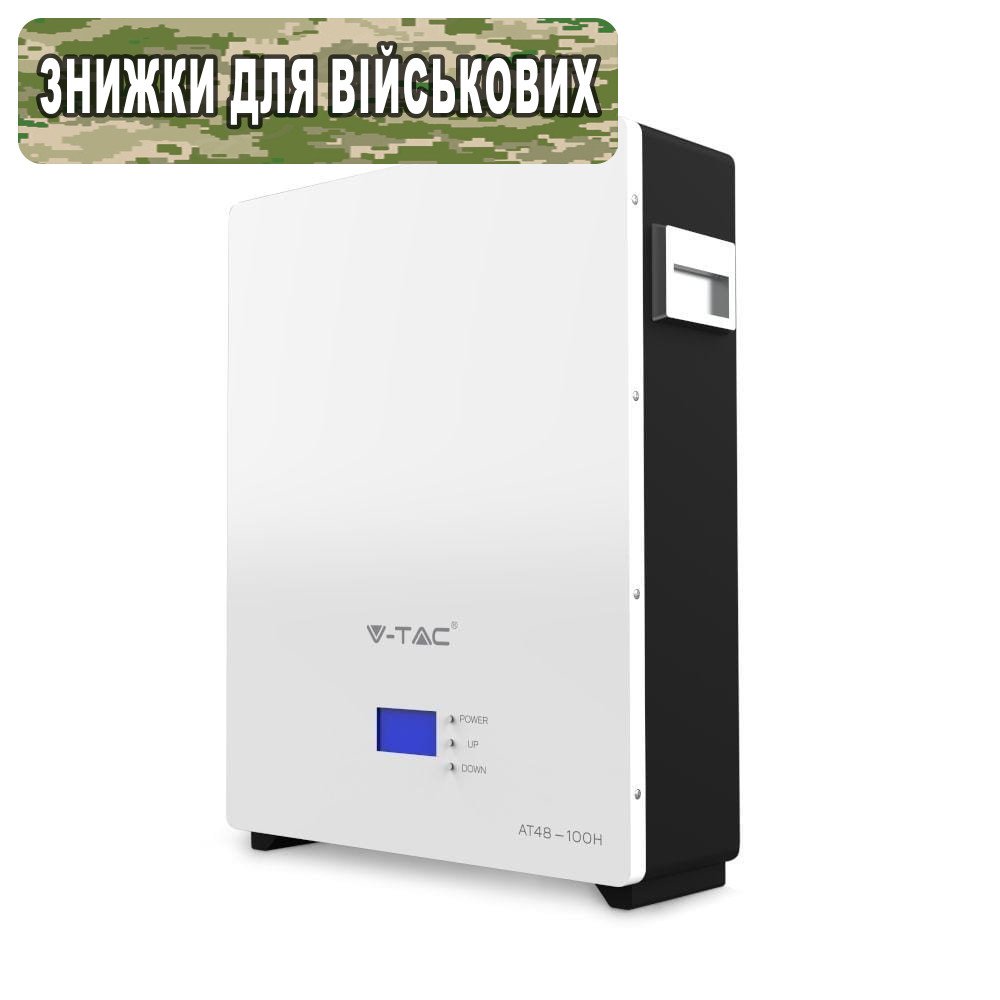 V-TAC енергонакопичувач з літієвою батареєю 51,2 В і ємністю 100 Ач призначений для фотоелектричних інверторів і здатний накопичувати електроенергію до максимальної ємності 5,12 кВт·год. Він має тривалий термін служби, здатний пройти 6000 циклів зарядки/розрядки. Цей акумулятор можна розмістити в стійці під номером SKU 11557 або аналогічному SKU 11376. Він сумісний з інверторами DEYE та більшістю інших низьковольтних інверторів. В комплекті йде повний кабель і система управління батареєю BMS. Існує можливість розширення кількості накопичувачів до 16 одиниць. Список сумісних однофазних інверторів V-TAC включає моделі: SKU11725 (3,6 кВт), SKU11547 (5 кВт), SKU11529 (6 кВт), SKU11803 (8 кВт). Трифазні інвертори, що сумісні з накопичувачем, включають моделі: SKU11743 (5 кВт), SKU11788 (6 кВт), SKU11542 (10 кВт), SKU11543 (12 кВт).