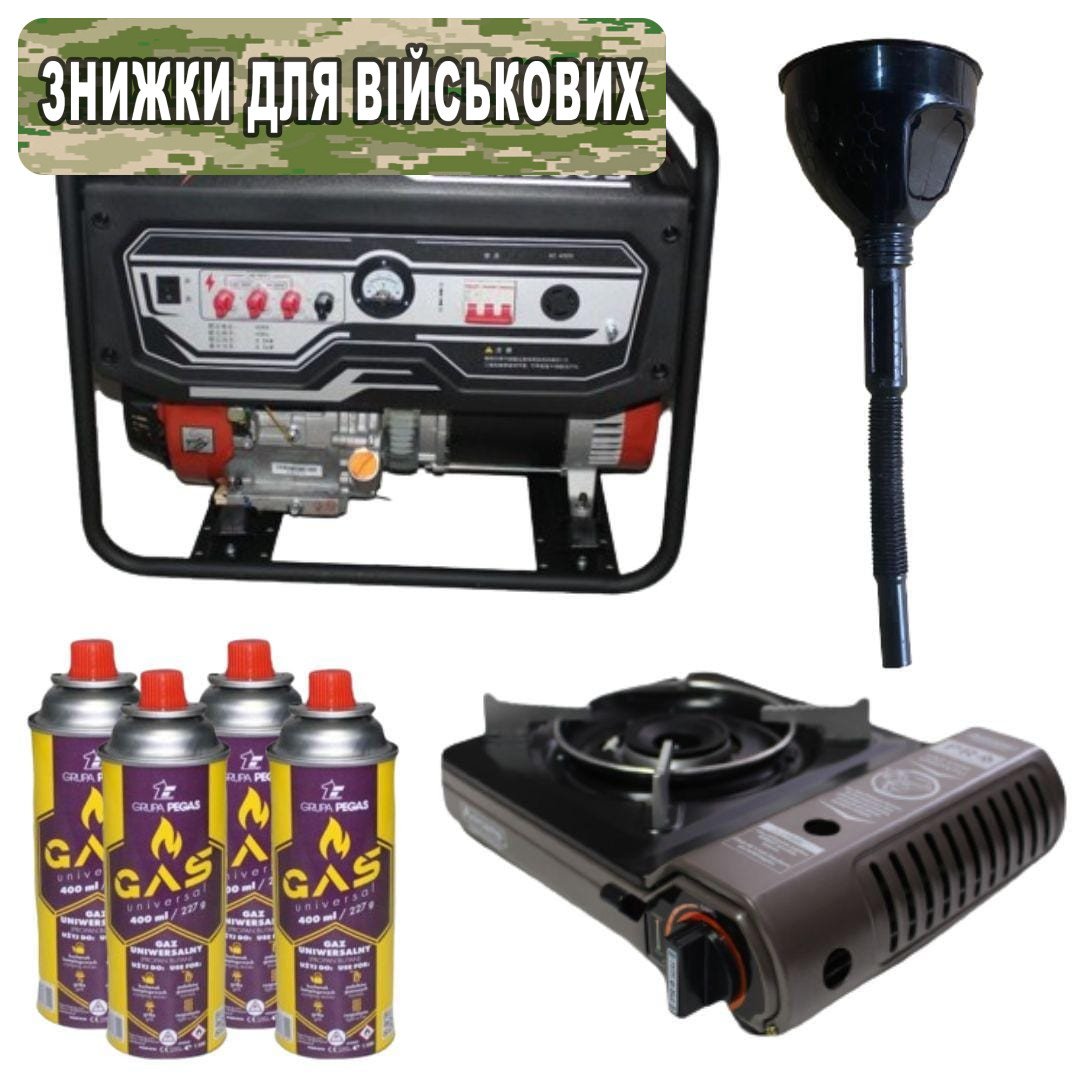 ОСОБЛИВОСТІ: Бензиновий генератор EF Power RD7500S – потужний генератор для автономної та аварійної подачі електроенергії для будівельних майданчиків, саду. Підходить для постійного та тривалого користування. Генератор вироблено із американською 30A 250V розеткою, тому ми БЕЗКОШТОВНО надаємо універсальний перехідник в комплекті до генератора. (детальніше: у фото) ПРИЗНАЧЕННЯ: Забезпечить електрикою всі прилади будинку (в тому числі енергоємні), а на будівельному майданчику – всі інструменти. ОБЛАСТЬ ВИКОРИСТАННЯ: Використовується для енергонезалежності заміських будинків, офісів, торгових точок в аварійних ситуаціях на лініях електропередачі, а також як мобільне джерело електрики для комунальних і дорожніх служб. Портативна газова плитка Orcamp CK-505 Портативна піч для кемпінгу чи далеких поїздок. Стійка та міцна, завдяки чому можна приготувати їжу у досить великій каструлі. Незамінна у будь-якій ситуації, коли ми далеко від дому і хочеться смачної, теплої їжі чи кави. Проста у використанні та легкий. Працює від газового балончика з цанговим з’єднанням. Точний контроль полум’я. Сучасна форма. Легкий та зручний дизайн. Картридж газовий Pegas 400 мл Підходить для всіх поширених газових плит та газових пальників. Вміст: 227 г/400 мл. Багатофункціональний картридж, який підходить для використання вдома і на природі, а також сумісний з усіма газовими приладами, які мають відповідне цангове місце розташування: газові плити, пальники, паяльні лампиТримати подалі від тепла та інших джерел займання. Захищати від сонячних променів та зберігати в добре провітрюваному місці. Картридж є одноразовим та не перезаправляється.