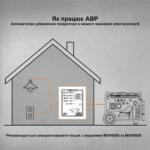 Блок АВР може працювати як в автоматичному, так і в ручному режимах. Має кнопку аварійної зупинки генератора.