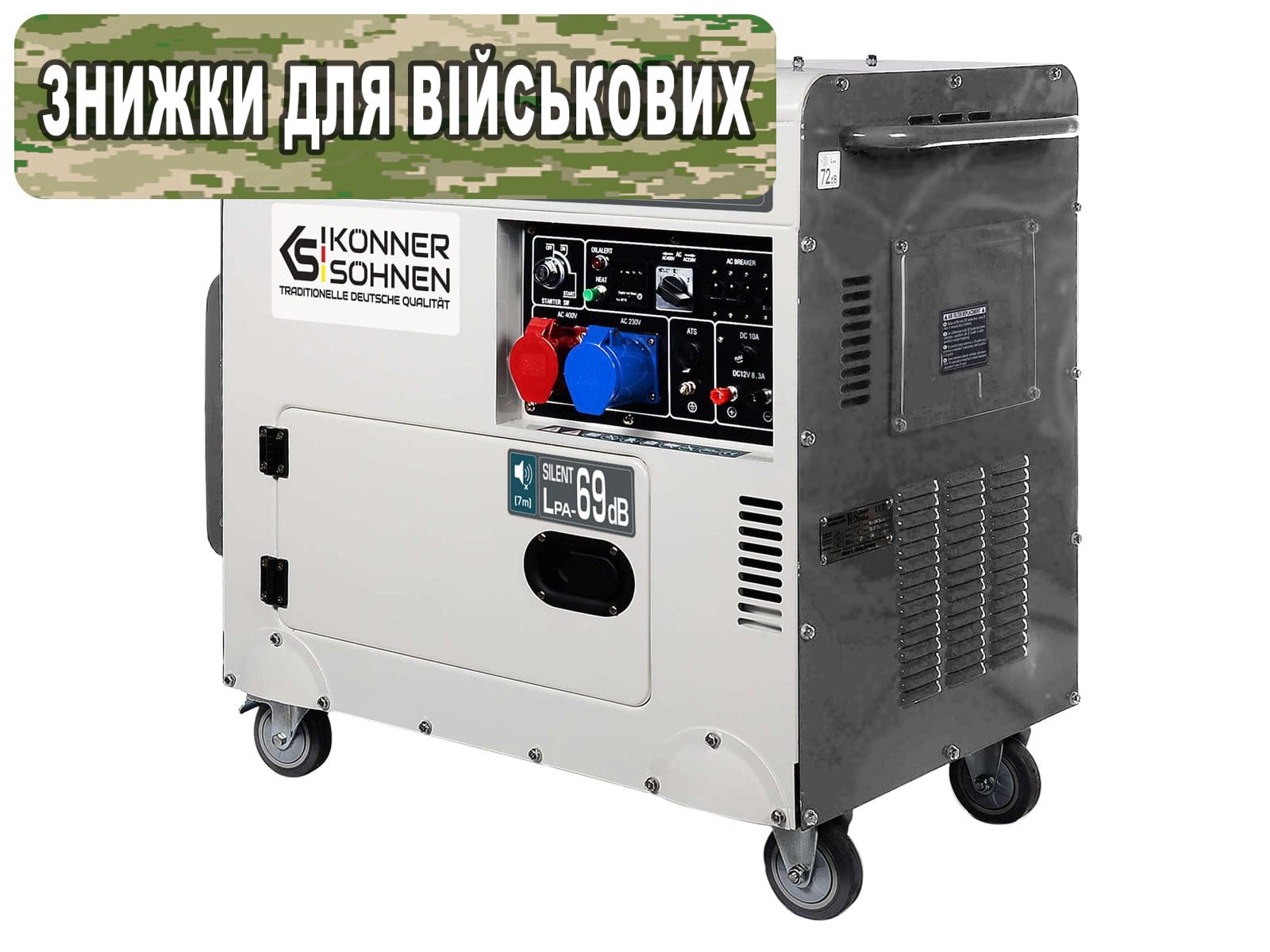 Всесезонний, шумопоглинаючий, антивандальний кожух забезпечує ефективний захист генератора і продовжує термін його експлуатації. Кожух оснащений ручками та транспортувальними колесами для зручного переміщення. - транспортувальні колеса: