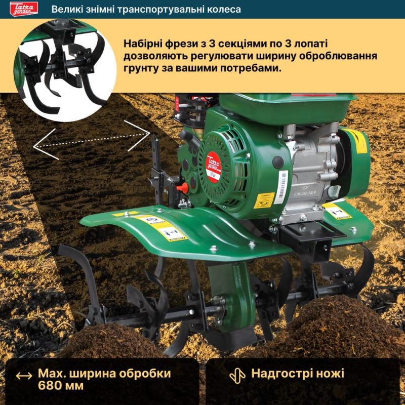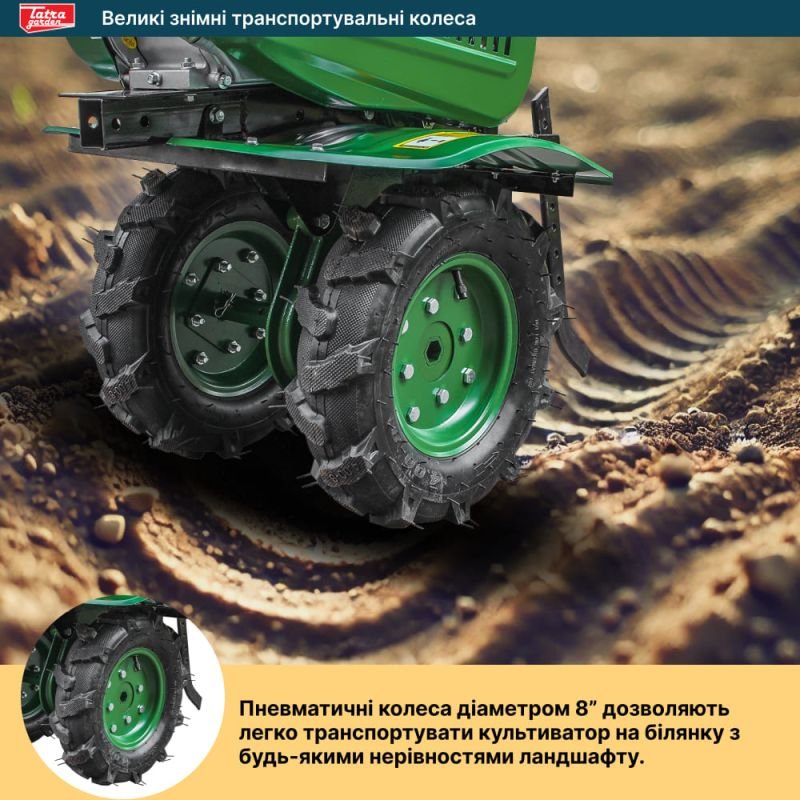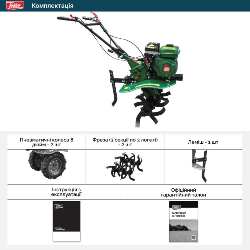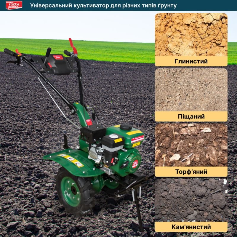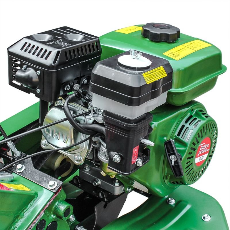- Фірмовий двигун з подовженим моторесурсом. Встановлено брендовий 4-тактний двигун Tatra Garden H168F (об’єм 211 см³, потужність 5.1 кВт / 7 к.с.), розроблений спеціально для культиваторів. Надміцний алюмінієвий поршень та спеціальна обробка деталей забезпечують підвищений крутний момент та тривалий термін служби.