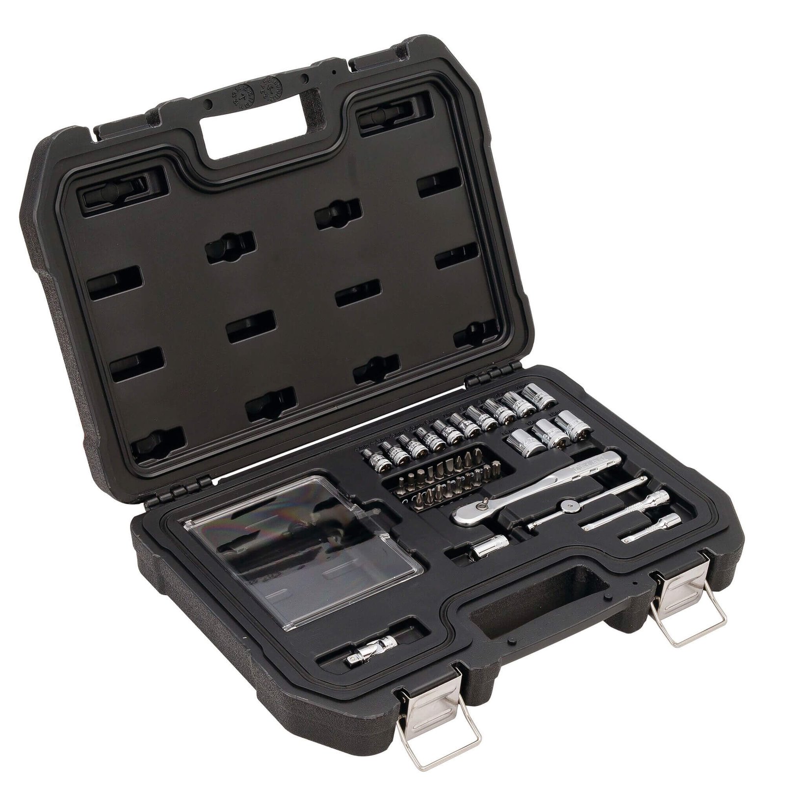 | Комплектація | В упаковці. Склад набору: Рукоятка з храповим механізмом 1/4”. Подовжувачі 1/4”, мм: 50, 75. Шарнір карданний 1/4″. Ручка Т-подібна 1/4″ 105 мм. Адаптер для вставок 1/4”. Біти викруткові 1/4″: 18 штук. біти Phillips 25 мм: PH1, PH2, PH3. біти Pozidriv 25 мм: PZ1, PZ2, PZ3. шестигранні біти 25 мм: H3, H4, H5. біти Torx 25 мм: T10, T15, T20, T25, T30, T40. плоскі біти 25 мм: SL4, SL5, 5, SL6. Торцеві головки 1/4”, мм: 4, 4.5, 5, 5.5, 6, 7, 8, 9, 10, 11, 12, 13, 14. Пластиковий кейс |